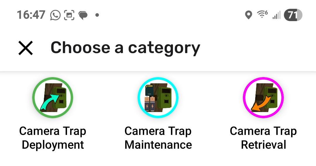 This information is captured using the Camera Trap Deployment category. The other categories are used for documenting camera trap maintenance, camera trap retrieval, and the path (track) to the camera.